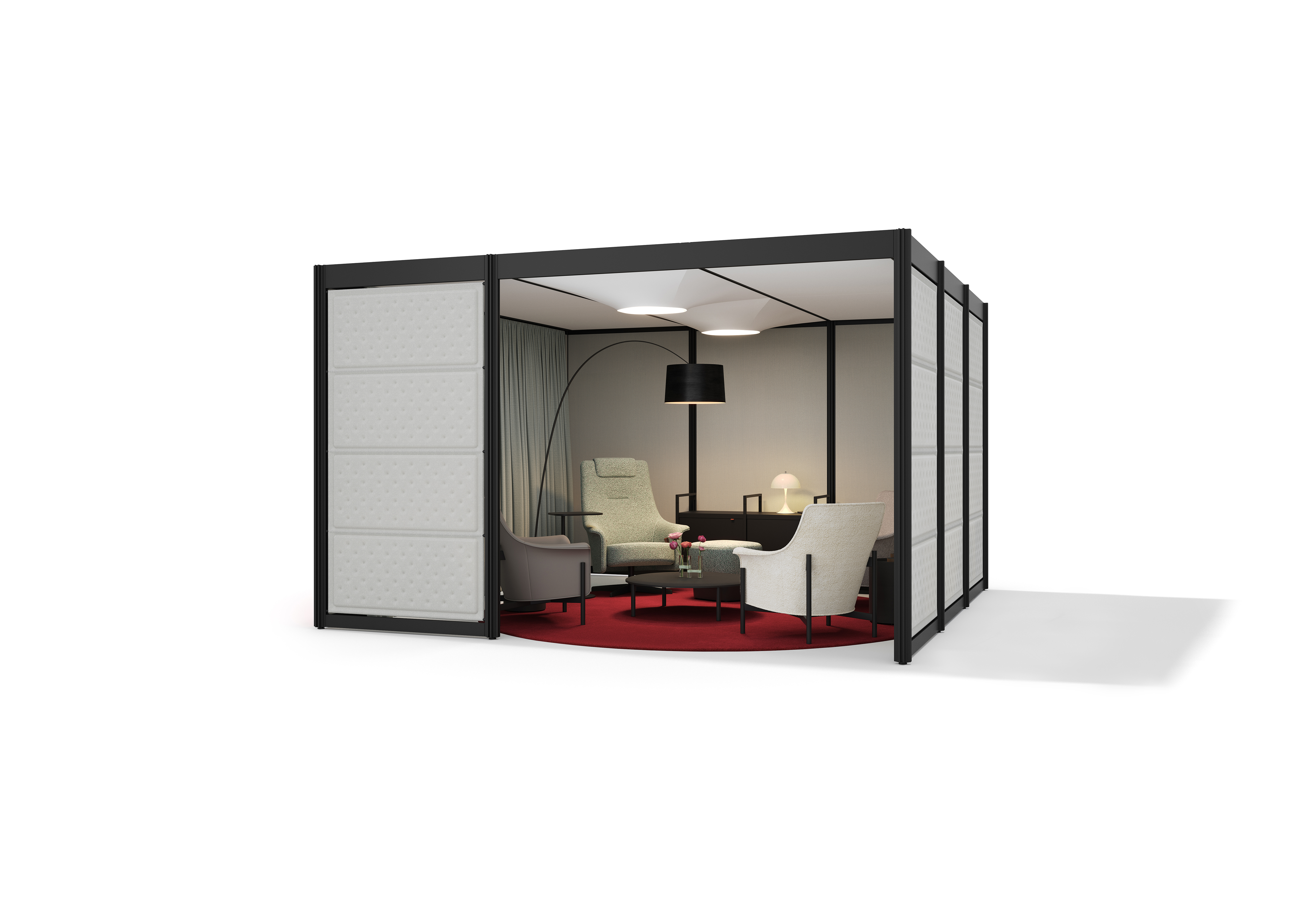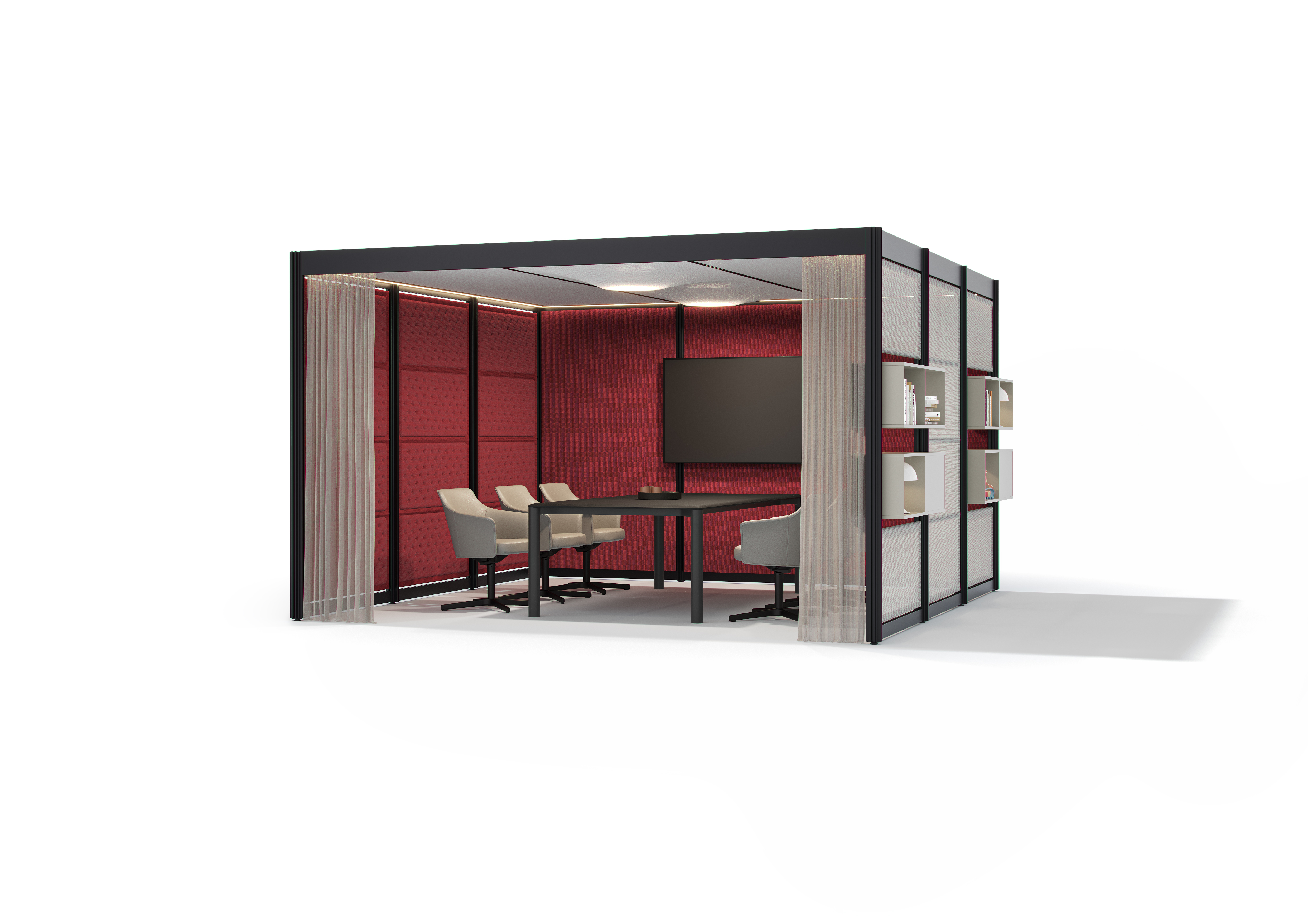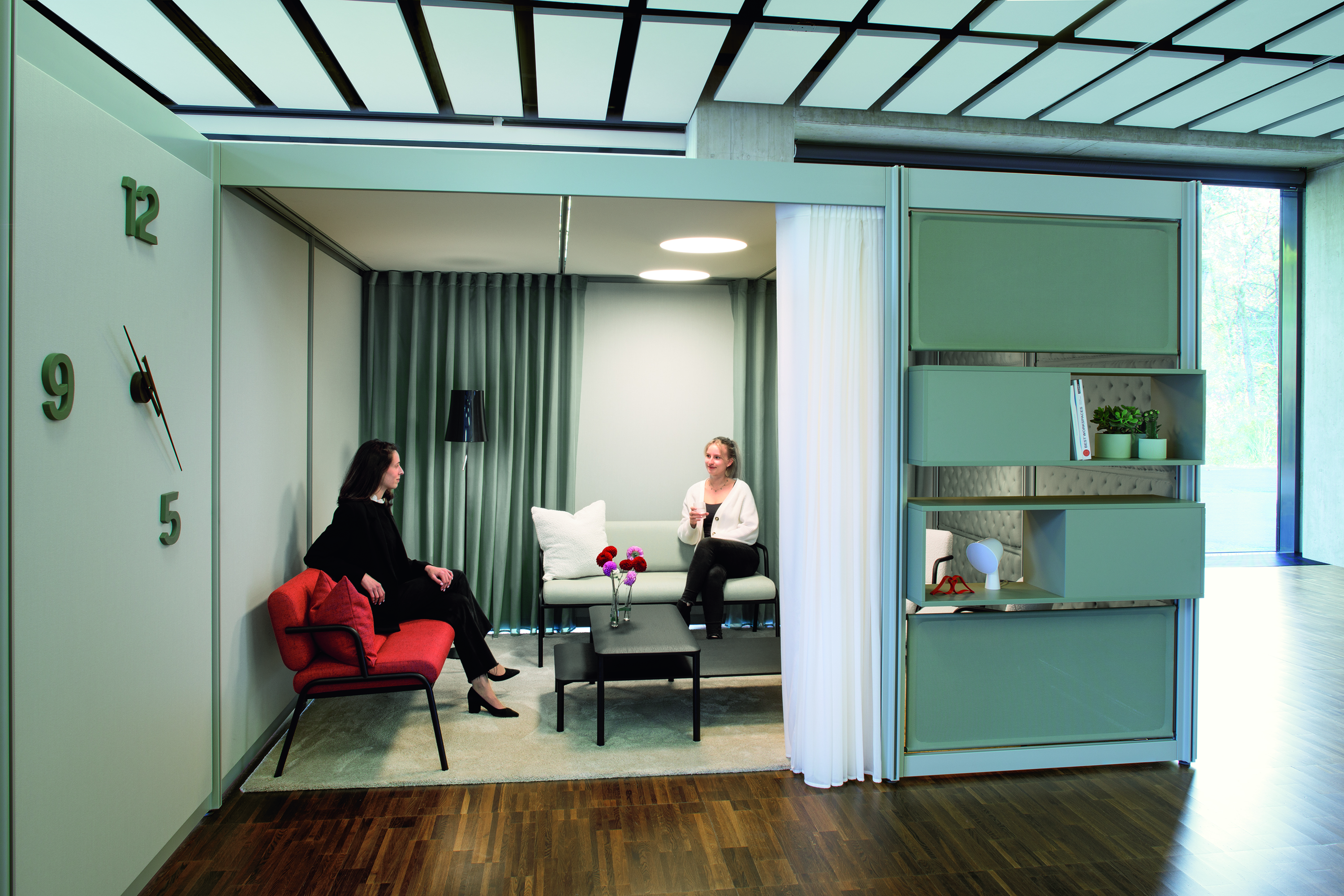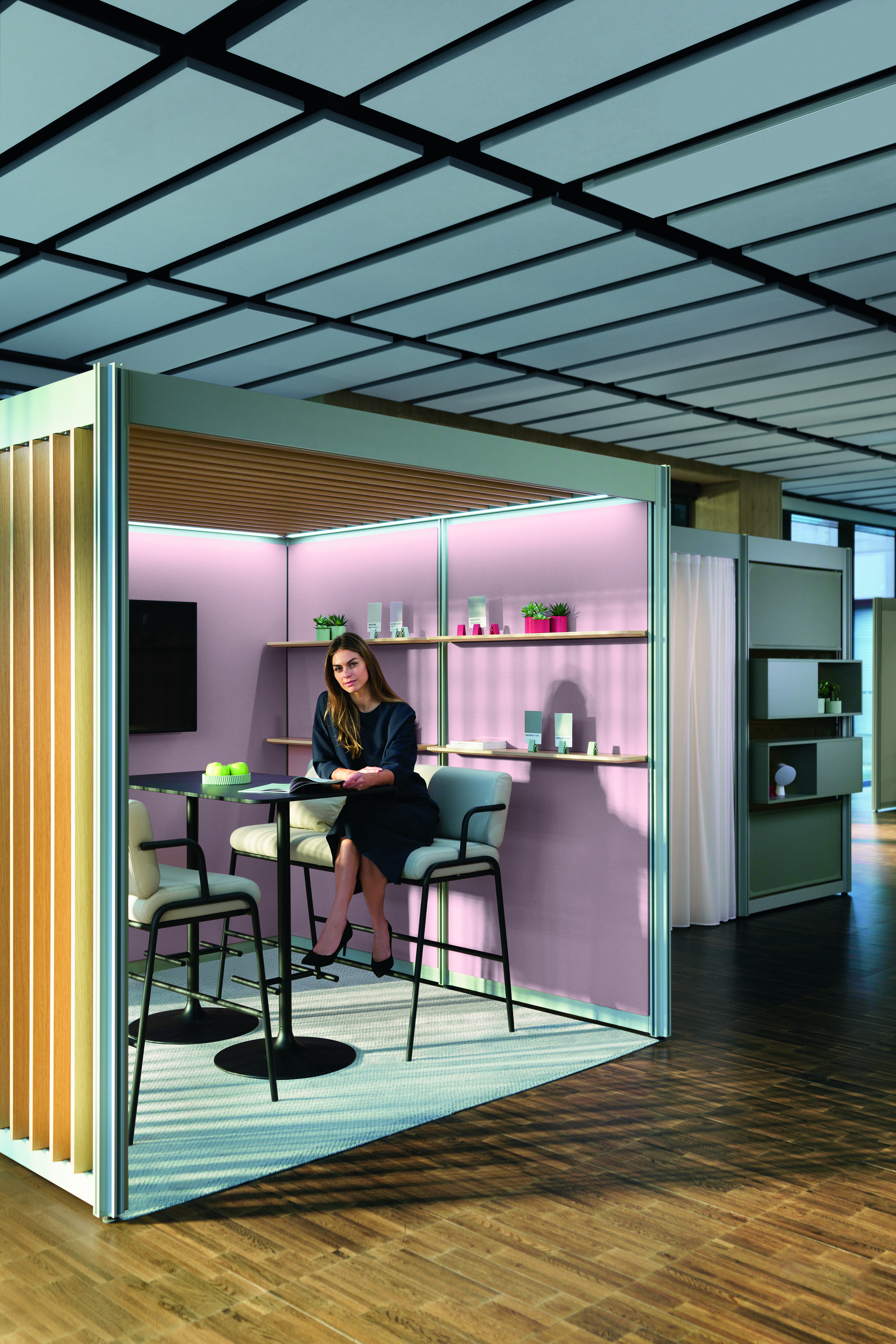 Zur individuellen Gestaltung steht eine Vielzahl an sogenannten On- und Infills in verschiedenen Materialien, Texturen und Farben zur Verfügung. Die Kombination der Module mit der passenden Beleuchtung, additiven Elementen und Accessoires sorgt dabei für das gewünschte Ambiente. Stoffe und Vorhänge in unterschiedlichen Texturen und Farben garantieren Gemütlichkeit. Regale aus Melamin oder Furnier strukturieren offene Räume, bieten praktischen Stauraum und dienen als Ablagefläche. Der Gestaltungsfreiheit sind hier keine Grenzen gesetzt: Anpassungen, Erweiterungen oder der Austausch einzelner Komponenten sind problemlos möglich. Optional kann POINTS mit blickdichten und akustisch wirksamen Vorhängen ausgestattet werden.