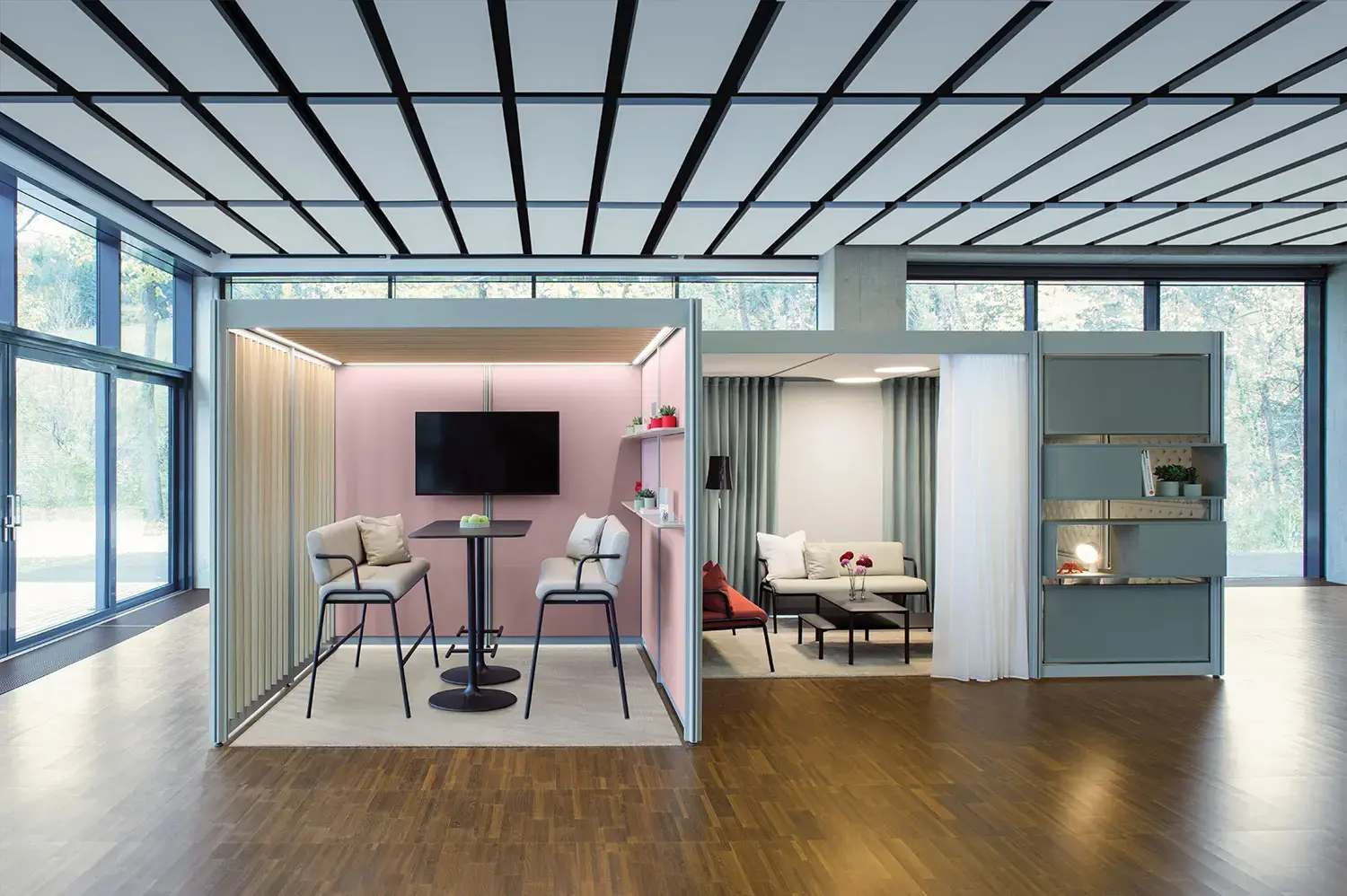 Intelligente Raumnutzung und maximale Flexibilität: Raum-in-Raum-Systeme von Bene sind die perfekte Lösung, um in professionellen Arbeitsumgebungen akustisch optimierte Zonen für ungestörte Kommunikation und konzentrierte Einzelarbeit zu gewährleisten.