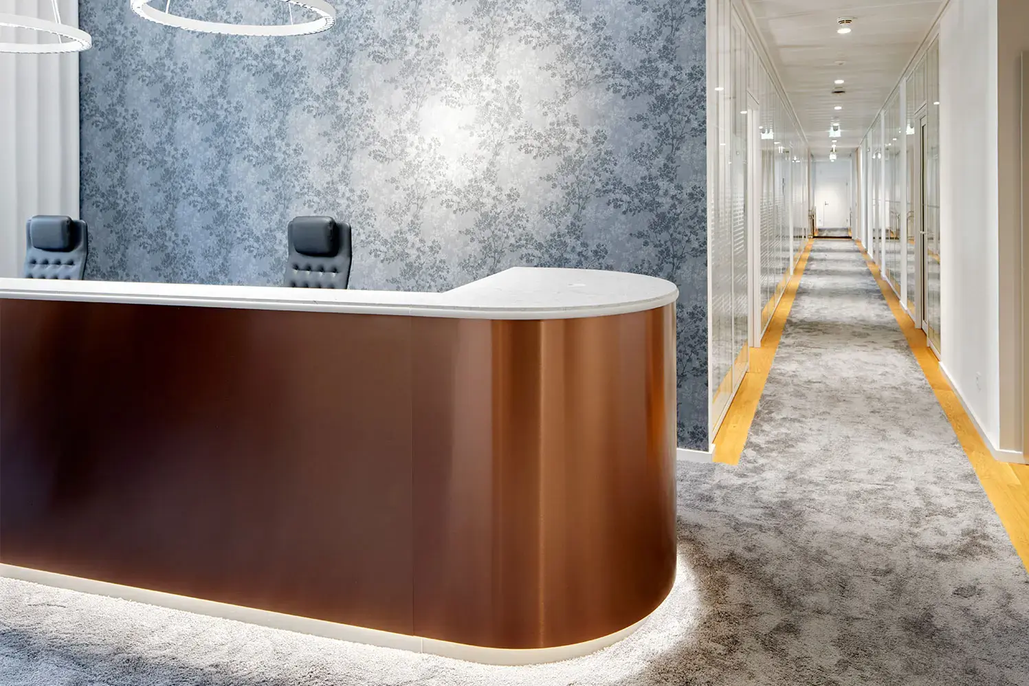 Der Eingangsbereich wurde individuell nach Maß gefertigt und durch hochwertige Tischlereinbauten ergänzt. Die Rezeption erhielt auf Wunsch des Kunden eine Verkleidung in edler Bronze. Damit wird die Wertigkeit des Unternehmens sichtbar gemacht und zugleich Wertschätzung gegenüber Kund:innen und Mitarbeitenden vermittelt.