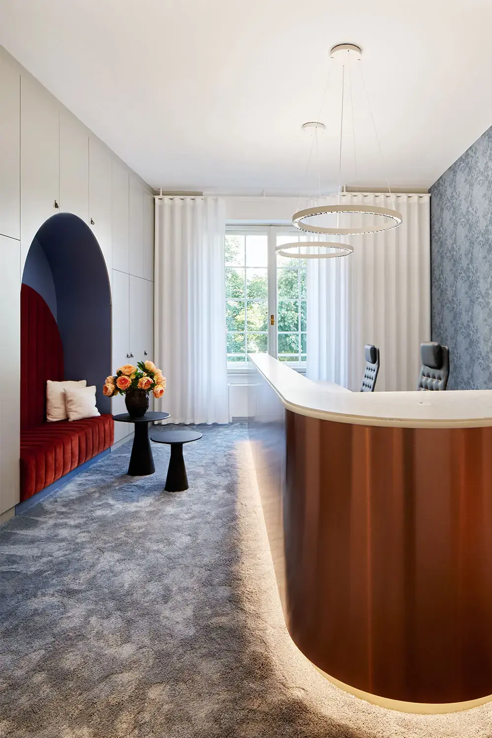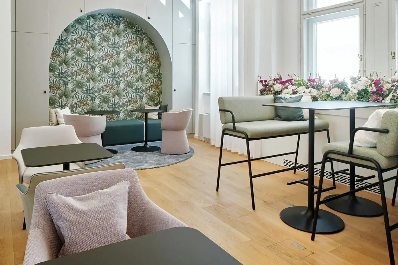Während in den Lounge- und Kommunikationsbereichen die CASUAL Bench High und der CASUAL Table High Raum für informelle Begegnungen schaffen. Besonders ins Auge fällt die in die Wand integrierte PARCS Causeway Sitzbank, die maßgefertigt in eine halbrunde Wandnische eingebaut wurde. Die Rückwand der Nische ist mit einem dekorativen, floralen Muster tapeziert, das dem Bereich einen wohnlichen und einladenden Charakter gibt.
