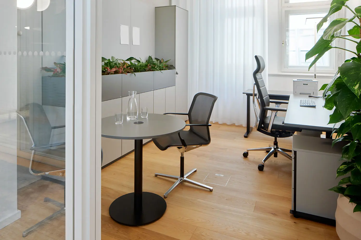 Im Bereich der Arbeitsplätze kamen Level Pure Lift Tische zum Einsatz, die ergonomisches Arbeiten durch Höhenverstellbarkeit ermöglichen. Ergänzend sorgt das K2 Stauraumprogramm für Ordnung und Struktur. Die Ausstattung jedes Büros wurde individuell nach dem jeweiligen Bedarf geplant. Eine Begrünung mit K2 Planter Boxes unterstreicht dabei eindrucksvoll die Modularität des K2-Stauraumprogramms.