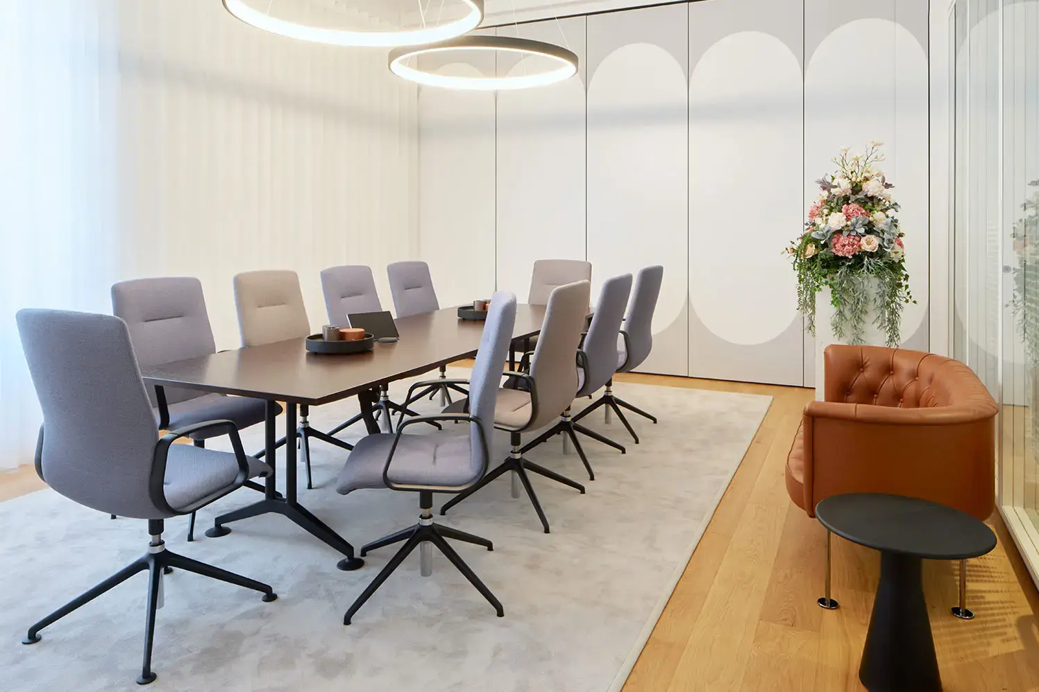 Eine besondere Stärke liegt in der flexiblen Raumnutzung: Zwei kleinere Meetingräume lassen sich zu einem großzügigen Boardroom verbinden, der bis zu 24 Personen Platz bietet.