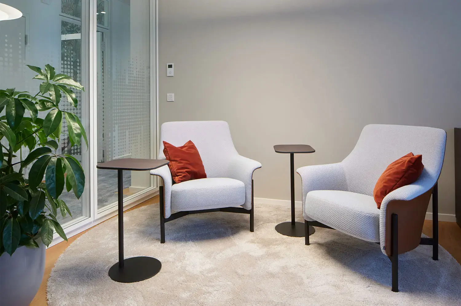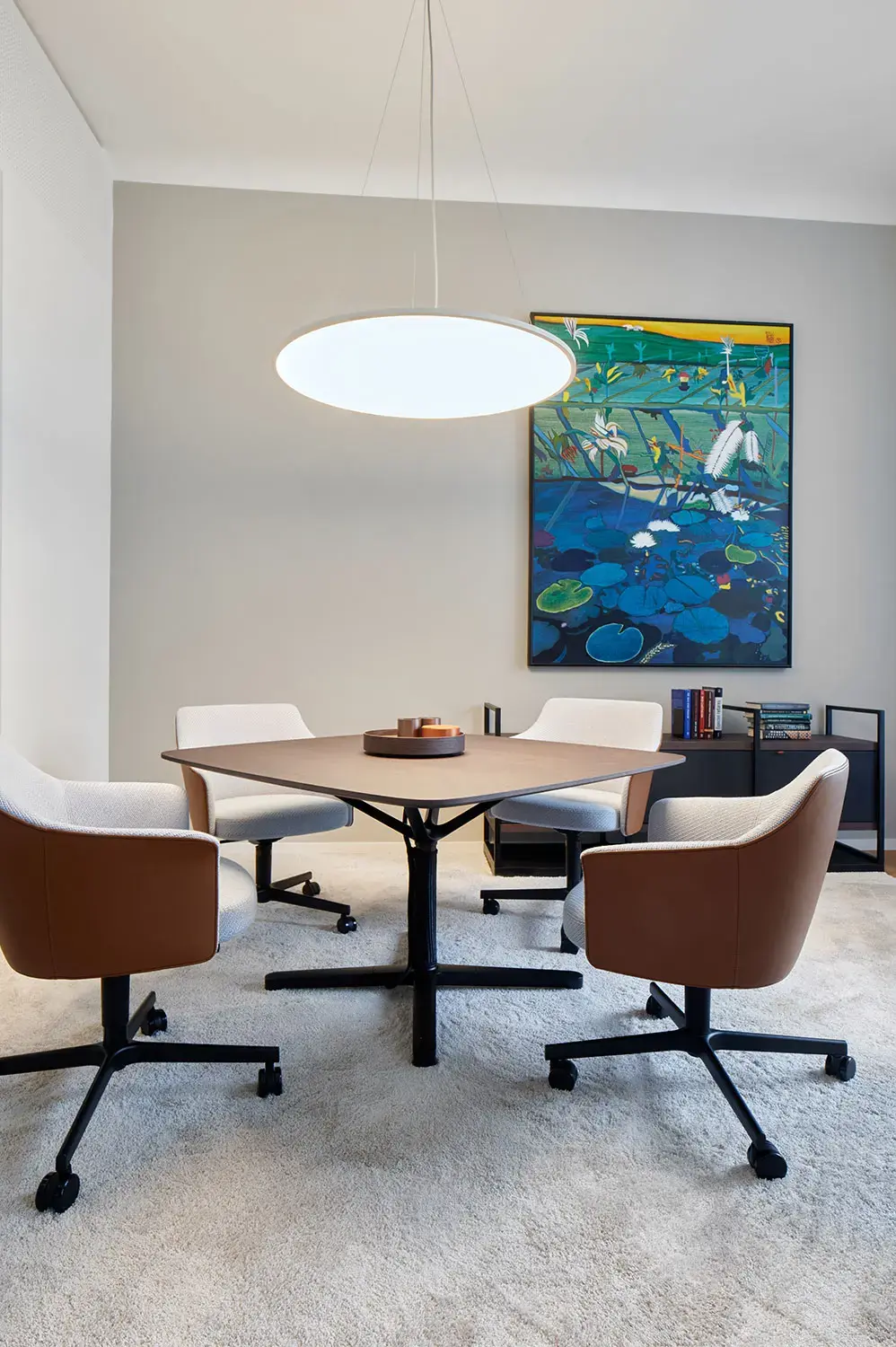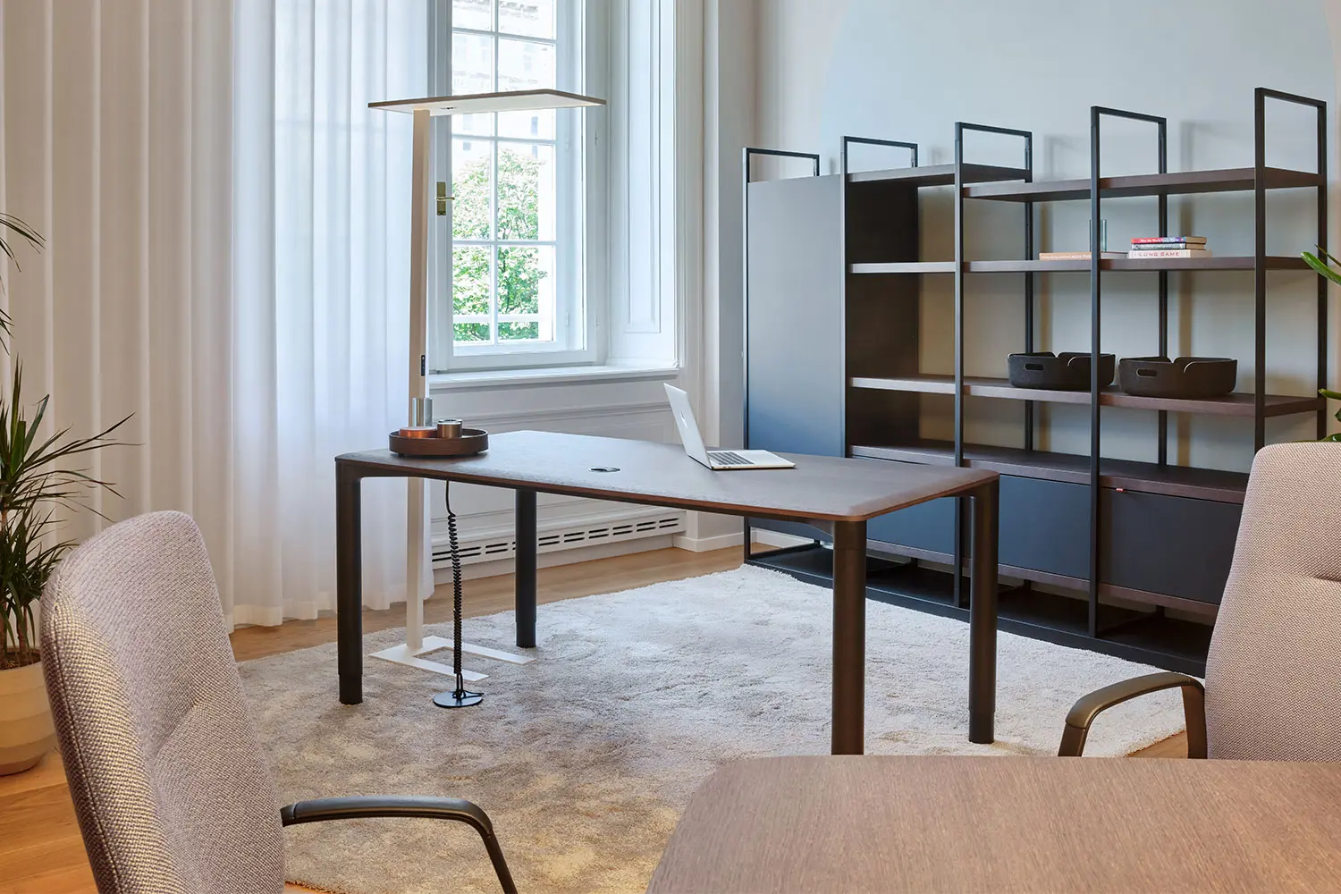 Die Management Offices wurden mit dem PORTS Table und PORTS Storage ausgestattet, die sich harmonisch in das moderne Raumkonzept einfügen. Die Einrichtung kombiniert funktionale Arbeitsbereiche mit komfortablen Sitzmöglichkeiten wie Sessel und Lounge Chairs und schafft so eine flexible Umgebung für konzentriertes Arbeiten und informellen Austausch.