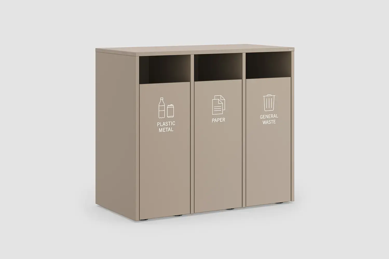 Aesthetic waste separation systems are essential in modern offices. The Recycling Station from Bene enables clean waste separation, promotes sustainability, and saves resources by reducing the number of waste bins required. When properly placed, it encourages communication and movement in the workplace.