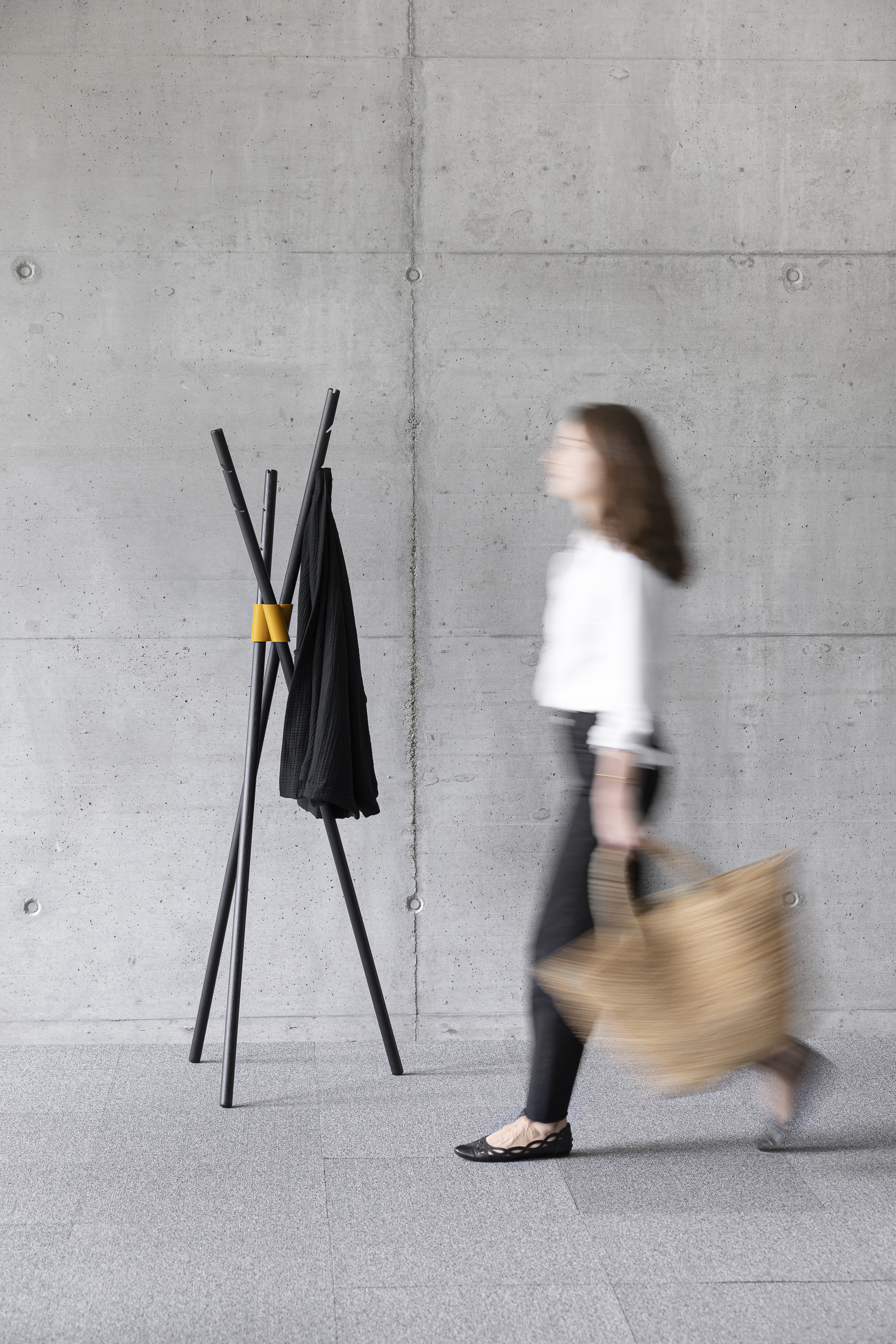 Stojak na ubrania składa się z trzech prostych drewnianych prętów połączonych trwałym węzłem z nadrukiem 3D. Drewno jest dostępne w kolorze naturalnym lub volcano.