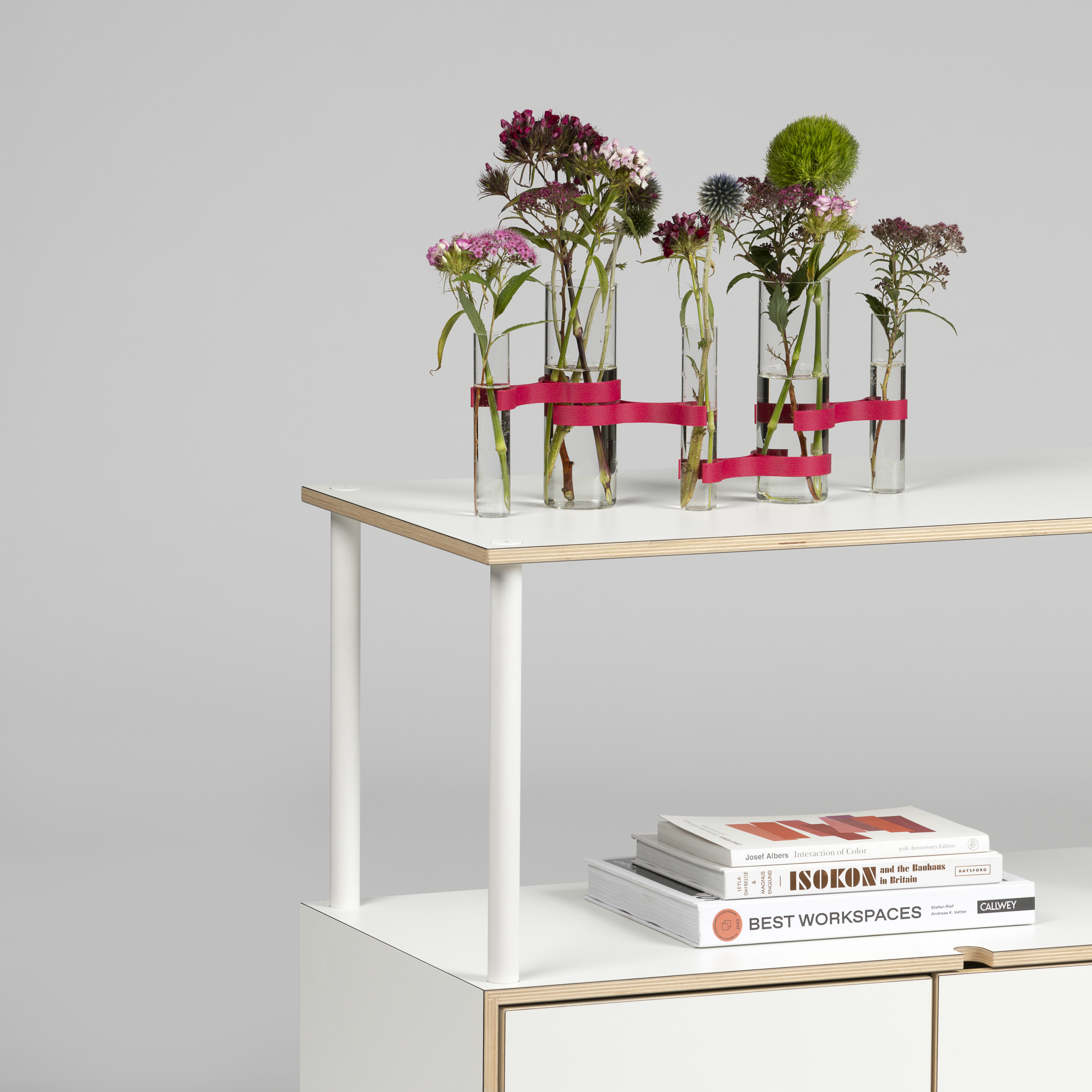 Sprytny system mocowania utrzymuje szklane wazony na miejscu i umożliwia niezliczone kombinacje. Unikalne dekoracje kwiatowe mogą być tworzone według potrzeb i przestawiane w dowolnym momencie. Szklane wazony są dostępne w dwóch różnych rozmiarach